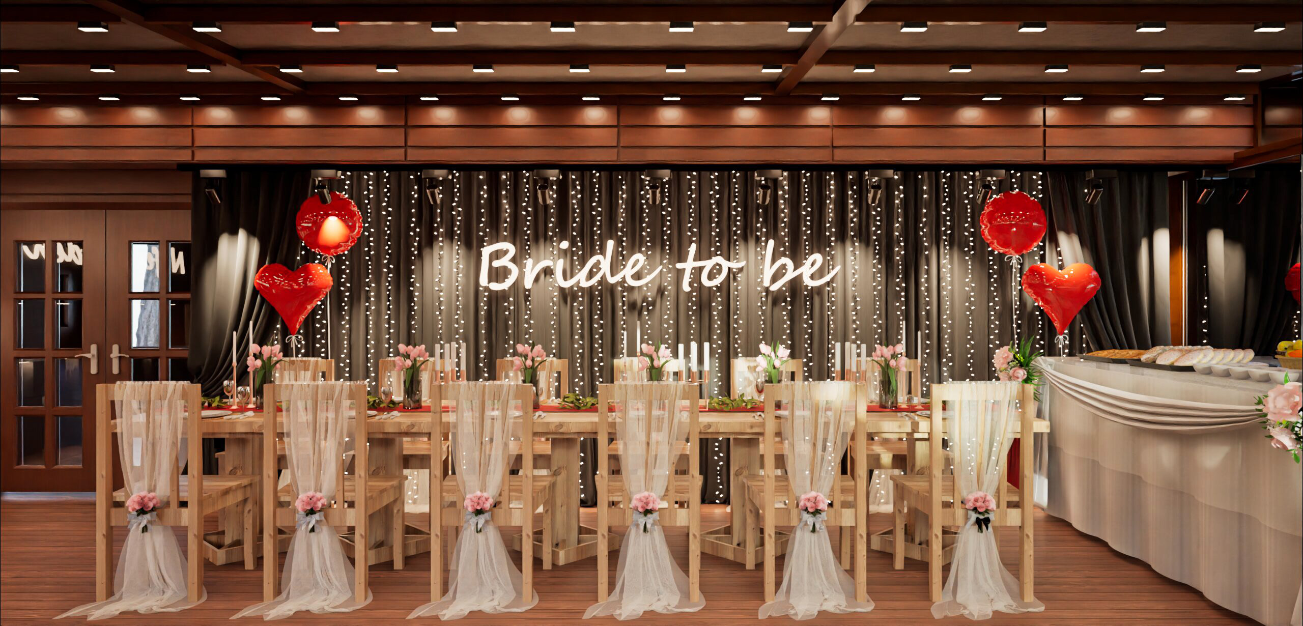 Farklı tarzları birleştiren eklektik bir dekorasyonumuz var. Dış mekanda ahşap mobilyalı bahçe takımlarının yanında hasır görünümlü sandalyeler, kır düğünü ruhuna yakışan beyaz masalar, farklı renklerde katlanır sandalyeler ve zarif sırt detaylı ahşap sandalyeler kullanıyoruz. Masaları süslerken rengarenk buketlerden, gümüş ve bronz rengi zarif şamdanlardan ve bohem örtülerden yararlanıyoruz. Çömlekler ve at arabası tekerlekleri bahçemize rustik bir hava katıyor. Ağaçların arasına renkli ışıklar asıyoruz. İç mekanda ahşap masaları rahat koltuklar ve minderli sandalyelerle çevreliyor, pastel pembe ve krem tonlarına ağırlık veriyoruz.